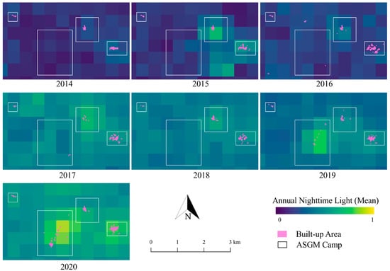 We studied the rapid transformation of activities in the C-ASGM sector from 2014–2020 using time-series associated with the built-up areas, the NTL, and precipitation data. A quantitative time-series analysis of the artificially constructed C-ASGM sectors can help to achieve better understanding of the rate of development of such mining activities and their transformations across time. Detecting such rapid transformations can provide significant insights into hidden, severe social problems inside these vulnerable mining communities, potentially resulting in the strengthening of environmental governance at various levels.