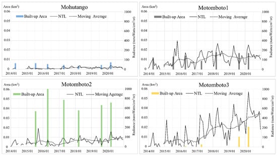 To deepen our understanding of the mining activities in the camps represented by the NTL intensity, the monthly NTL intensity and the 12-month moving average of NTL were graphed against the built-up areas (Figure 4). Even though the NTL intensities vary by camps, the study found a similar trend of the NTL intensity by season. For example, lower NTL intensities were found in the rainy seasons—i.e., during April–June and November–December—while higher intensities were found in the other months, during the dry seasons. There was no significant change in the maximum values in the Mohutango and Motomboto camps 1 and 2; however, the NTL from Motomboto camp 3 showed a 2.0-fold increase for 2014–2020. Furthermore, notable increases in the NTL were found in Motomboto camp 3 even in the rainy season, along with the growth of built-up areas since 2017. The 12-month moving average for Motomboto camp 3 also showed a continuous increase.