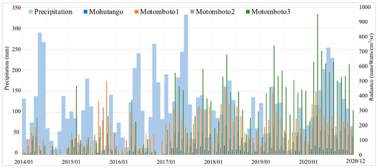 Precipitation data was acquired from CHIRPS for the period 2014–2020. Before the CHIRPS data were analyzed, data consistency was evaluated using reference data observed at Bone Bolango climatology station provided by the Indonesian Agency for Meteorology, Climatology and Geophysics (BMKG) [49]. Precipitation data provide by CHIRPS were accumulated in the form of monthly data to match the monthly data provided by BMKG. After the data validation, the sums of the amounts of precipitation by month were calculated for each camp. These results were graphed together with the detected monthly NTL.
