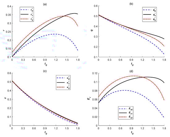 As shown in Figure 1a, the rising tax rate t0 would not always promote the manufacturer to improve emissions reduction levels in the above three cases. In each case, the emissions reduction cost will play a more critical role in determining emissions reduction level as t0 increases. When other parameters are constant, the rising t0 would lead to the decline in the critical value of emissions reduction cost coefficient forcing the manufacturer to begin to reduce the emissions reduction level. Therefore, with the increase of t0, emissions reduction levels initially increase and then decrease, which is consistent with Corollary 2. However, government subsidies create wider conditions of t0 in improving emissions reduction investments, especially under ER subsidy. In this way, the emissions reduction cost coefficient is always higher than the certain critical value of k forcing the manufacturer to begin to decrease low-carbon products in each case. Consequently, because of the higher emissions reduction cost, the manufacturer’s optimal manufacturing quantities and total profits are declining with the increase of t0 as shown in Figure 1b,c, which is also consistent with Corollary 3. Accordingly, as t0 increases, the manufacturer’s emissions reduction quantities also initially increase and then decrease since manufacturing quantities are decreasing and growth rates of emissions reduction levels are declining, or even negative. This implies that although a carbon tax regulation can promote manufacturers’ emissions reduction levels to some degree, a higher tax rate would weaken manufacturers’ tolerance of emissions reduction cost, thereby severely restraining their production activities and total profits and discouraging manufacturers’ enthusiasm to further improve emissions reduction levels.