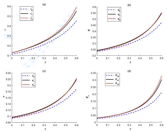 As shown in Figure 2, all variable values are gradually increasing in the above three cases as low-carbon sensitivity coefficient γ increases. This indicates that enhancement of consumer low-carbon awareness can better help manufacturers achieve win–win situations of economic and environmental benefits. Thus, as mentioned above, it is significant for the government and manufacturers to positively propagandize low-carbon products, such as popularization and education of low-carbon environmental protection, diversification and vigorous publicity of low-carbon products. Moreover, all variable values are higher under both two government subsidies compared with that under no government subsidy, and the rising γ would also make the positive effect of government subsidies more apparent. Furthermore, as shown in Figure 2, each variable value under IC subsidy is gradually higher than that under ER subsidy as γ increases. Consequently, when more consumers accept and approve low-carbon products, the IC government subsidy can better encourage manufacturers to launch emissions reduction activities to achieve low-carbon production and their own development. This is mainly because, when consumers have stronger low-carbon awareness, manufacturers’ emissions reduction investment can be timely and fully repaid. Therefore, manufacturers can be effectively encouraged to improve emissions reduction investment.