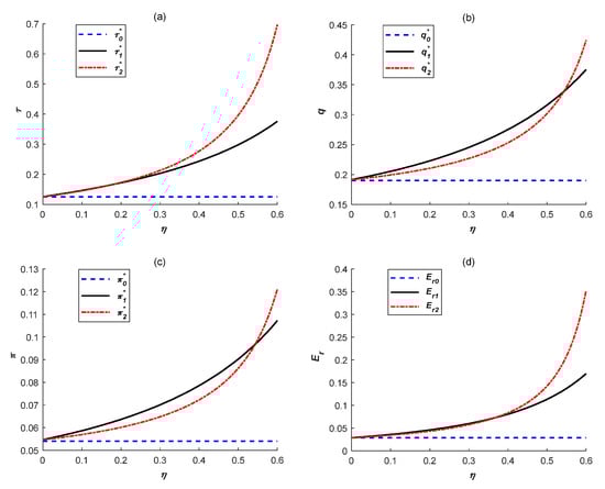 As shown in Figure 3, all variable values are gradually increasing under ER subsidy and IC subsidy as subsidy rate η increases, which is consistent with Corollary 5. Meanwhile, each variable value under IC subsidy is gradually higher than that under ER subsidy as η increases. Therefore, for the government, it is necessary to determine which subsidy will be adopted considering the range of subsidy rate affected by government budget constraint. For instance, when the budget is enough and the government determines to raise subsidy rate, the IC subsidy is gradually more beneficial to manufacturers’ low-carbon production and their own development. In this way, the government could share manufacturers’ investment risk to some degree, which can effectively encourage manufacturers to improve emissions reduction levels.
