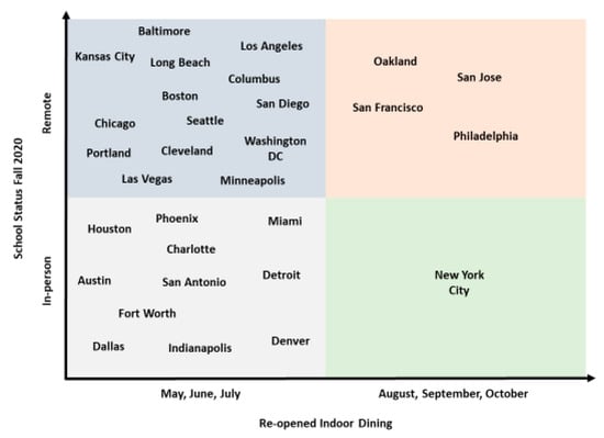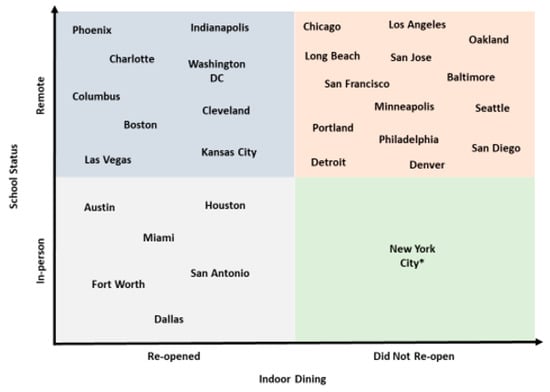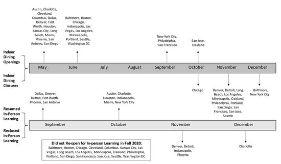 We compare the re-opening of in-person learning in public elementary schools and indoor dining re-openings between 1 May 2020 and 14 December 2020 across the 30 study cities. These dates were selected to reflect when restaurants in many cities first re-opened indoor dining, following early spring closures, and when schools went on winter break in late fall 2020. We focus on cities to highlight local heterogeneity in re-opening decisions, as there are substantial differences in the scope of local governments’ authority to regulate indoor dining and re-opening of public schools. While some cities and states re-opened middle and high schools for in-person instruction in addition to elementary schools, we focus on public elementary school re-openings because the long-term social and health impacts of in-person elementary learning are clearly stated in the literature and elementary school children have had the hardest time with remote learning [,]. We define re-opening for in-person learning as bringing back the majority of public elementary school students for in-person instruction, including schools that brought students back part-time (i.e., hybrid learning models). Several public-school districts such as Baltimore, Boston, and San Diego only brought back for in-person instruction a small number of students with the greatest needs, including English-language learners, students who were homeless, and students with disabilities. Because these school districts did not bring back broader groups of students, we did not categorize these schools as re-opened for in-person learning, until they brough back the majority of students. We define re-opening indoor dining as any dining inside of a restaurant, with or without capacity restrictions. We collected information on statewide and city/county orders by searching multiple publicly available databases and state/city websites listing these orders, reviewed state/city orders, and identified public statements by searching news articles, Twitter posts, and state/city websites (see Appendix A).