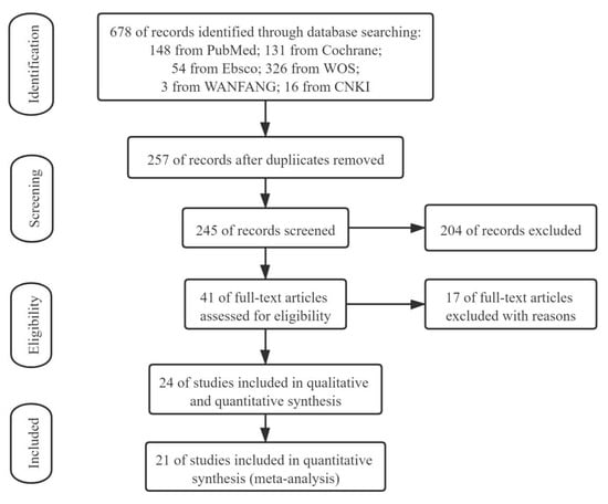 The initial search yielded 678 studies (148 from PUBMED, 131 from Cochrane, 54 from Ebsco, 326 from WOS, 3 from WANFANG and 16 from CNKI). After removing 421 duplicates, we conducted a title and abstract search in the remaining 257 articles, which resulted in 41 studies. As for 216 excluded studies, the main causes were no data on the outcome of interest, no appropriate control group or participants < 18 years. After evaluating the abstracts of each study, we excluded 17 studies for failing the priori inclusion/exclusion criteria. Three articles were excluded after a close reading of the text for unavailable data. The final analysis consisted of 21 articles and 755 participants (Figure 1).