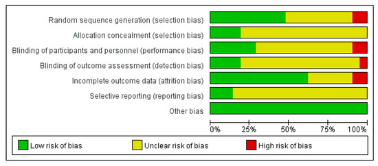 Two independent reviewers (L.M. and D.W.) assessed the quality of included studies using the risk of bias tool provided by the Cochrane Handbook for Systematic Reviews of Interventions [16]. A total of 7 items were assessed for each study: selection bias (random sequence generation and allocation concealment), performance bias (blinding of participants and personnel) detection bias (blinding of outcome assessment), attrition bias (incomplete outcome data), reporting bias (selective reporting) and other bias. For each item, there are three potential bias judgments: “low risk” “high risk” or “unclear risk”. Disagreements between the reviewers were resolved by discussion, with the involvement of a third author (Y.Y.) where necessary.