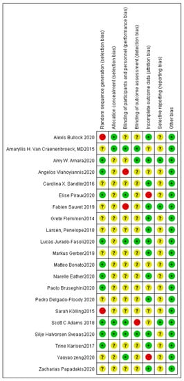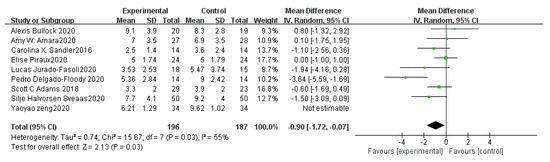 As shown in Table 3, subgroup analyses were conducted for PSQI and SE. The results indicate that any type of HIIT can significantly reduce PSQI global scores [WMD = −0.53, 95%CI (−1.29, 0.24), p = 0.02, n = 3] [WMD = −1.62, 95%CI (−3.16, −0.08), p = 0.04, n = 6], while other type seems to be more effective; HIIT intervention duration >16 min and intervention lasts >8 weeks can significantly reduce PSQI global scores [WMD = −1.43, 95%CI (−3.09, 0.23), p < 0.0001, n = 5] [WMD = −1.10, 95%CI (−2.23, 0.03), p = 0.0009, n = 6]. Limited evidence indicates that HIIT frequency less than three times per week have better effects on PSQI global scores [WMD = −1.43, 95%CI (−3.09, 0.23), p < 0.0001, n = 3], compared with frequency high group. As for SE, subgroup analysis shows other types of HIIT was superior to cycling [SMD = 0.27, 95%CI (0.02, 0.52), p = 0.02, n = 7]. Low frequency HIIT intervention can bring more benefits [SMD = 0.53, 95%CI (0.26, 0.80), p = 0.007, n = 7], which is consistent with PSQI subgroup analysis [WMD = −2.13, 95%CI (−3.68, −0.59), p = 0.0001, n = 6]. There is no significant difference between different length subgroups for SE. Effects were significant for patients regardless of PSQI global scores and SE [WMD = −0.98, 95%CI (−1.90, −0.06), p = 0.04, n = 6] [SMD = 0.56, 95%CI (0.18, 0.95), p = 0.04, n = 3].