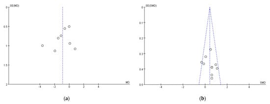 PSQI refers to the Pittsburgh Sleep Quality Index, which is a classic subjective measurement of sleep quality. A total score, as well as seven subscale scores (daytime sleepiness, sleep disturbance, sleep duration, sleep efficiency, sleep latency, sleep medication use, and subjective sleep quality) were provided by PSQI [42]. The sleep quality increases with the decrease of PSQI global score. A total of eight articles reported this outcome after removing one primary study from the pooled analysis because of bias [33]. Figure 4 shows a forest plot of each individual study. These articles [21,26,29,30,31,33,38,40] included 383 participants while only three of them provided subscale scores. Overall, HIIT has large beneficial effects on sleep quality reflected by PSQI global scores [WMD = −0.90, 95%CI (−1.72, −0.07), p = 0.03, n = 8]. Since I2 > 50, a random-effects model was used to calculate them. A funnel plot of PSQI was shown in Figure 5a, which appears to be asymmetrical. Moreover, the Insomnia Severity Index (ISI) is a commonly used brief self-report tool measuring insomnia [43]. A higher score suggests more severe insomnia and worse sleep status. The effects were highly statistically significant in the category of ISI [WMD = −1.65, 95%CI (−2.43, −0.87), p < 0.0001, n = 3]. However, there were not enough available studies [23].