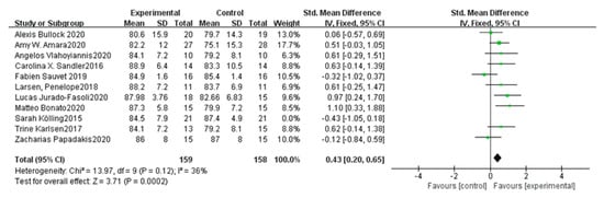 As for objective outcomes, sleep efficiency (SE), sleep latency (SL), total sleep time (TST), and time in bed (TB) were assessed by different measurements such as Sense Wear Armband (SWA), Actiwatch and polysomnography (PSG). Our result indicates that HIIT has small-to-medium favorable effects on SE [SMD = 0.43, 95%CI (0.20, 0.65), p = 0.0002, n = 10] after removal of one study with high heterogeneity [34]. A total of 10 studies [20,21,22,25,26,28,30,36,37,39] compared SE pre- and post-intervention for a control group and experimental group included in the SE meta-analysis. Specifically, each individual study and aggregate ES for HIIT on SE are presented in Figure 6. Since I2 = 36%, fixed-effects model was used to calculate them. In addition, the adjusted funnel plot of SE is showed in Figure 5b, which appears to be asymmetrical. Both sensitivity and cumulative meta-analyses confirmed the reliability and stability of the findings. However, no significant effects were found in SL [SMD = 0.43, 95%CI (0.20, 0.65), p = 0.52, n = 7], TST [SMD = 0.08, 95%CI (−0.17, 0.33), p = 0.92, n = 9] and TB [SMD = −0.13, 95% CI (−0.48, 0.23), p = 0.48, n = 4].