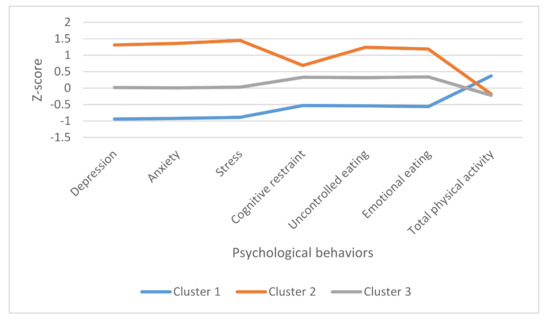 The cluster analysis categorized participants in three different profiles: cluster 1 named as “psychological well-being, appropriate physical activity levels and eating behaviors”, cluster 2 named as “psychological well-being and cognitive restraint”, and cluster 3 named as “moderate psychological distress and cognitive restraint” (Table 2, Figure 1).