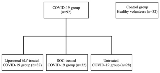 A total of 92 patients with confirmed COVID-19 infection at reverse transcriptase real time (rRT)-PCR were recruited to participate in this study. Patients were divided into three groups according to the administered treatment. Thirty-two patients were treated with liposomal bovine lactoferrin (bLf); another 32 patients received a standard of care (SOC) regimen; while 28 patients did not receive any treatment against COVID-19. As a control group, 32 healthy volunteers with negative COVID-19 infection at rRT-PCR naso-oropharyngeal swab were recruited.