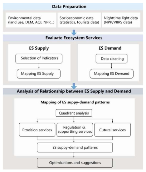 To address this research gap, a measuring system for ES supply–demand patterns was developed in mountainous cities based on existing studies. In particular, we proposed an operational method of measuring the demand of ES supply: i.e., we used the nighttime light data. This study aimed to propose an operational framework for mapping ES supply–demand patterns in mountainous cities. First, we assessed the ES supply based on multi-criteria: i.e., water supply for provision services; water regulation, water purification, carbon cycling, air purification, temperature regulation for regulating and supporting services, and recreation function for cultural services. Then, the nighttime light data were collected to evaluate the demand for ESs, and quadrant analysis was used to evaluate the matches between ESs supply and demand. Finally, we applied the ES supply and demand patterns to identify the imbalance of urban ecosystem. The research framework is shown in Figure 1. The results for mapping ES supply–demand patterns can provide operational suggestions for policy decision-making, especially in green space planning and management.