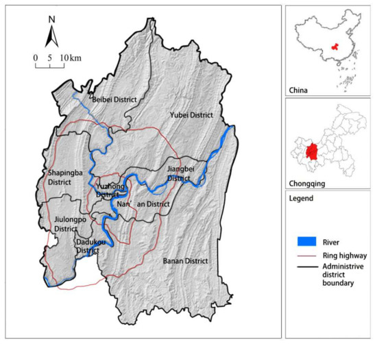 We chose Chongqing city proper as the case. Chongqing is the one of the municipalities directly under the State Council in western China and a typical mountainous city on the upper reaches of the Yangtze River. The study area covers nine core urban districts of Chongqing, including Yuzhong, Jiangbei, Nanan, Shapingba, Dadukou, Jiulongpo, Yubei, Banan, and Beibei (Figure 2). Rapid urbanization in recent decades has caused a series of environmental issues in the core urban area of Chongqing—such as soil erosion, air pollution, flooding, and heat island effect [45,46].
