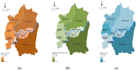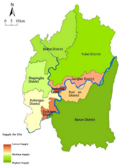 Looking at the spatial distribution of different ESs types (Figure 4), Banan District and Beibei District have higher values of all types of services, while Shapingba District shows a higher value of cultural services. Due to its large scale of green spaces, a high supply of regulating and supporting services was distributed in Yubei district. In general, districts with high supply of ESs were scattered in the rural areas located in the south and north of the study area, while the districts with low supply of ESs were concentrated mostly at the center of the study area (Figure 5).