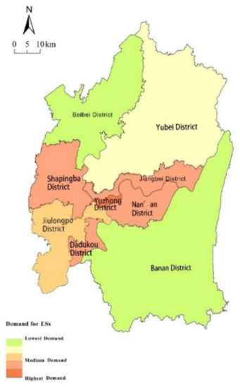 This study used nighttime light intensity to reflect the demand for ESs at the district scale (Figure 6). The demand for ecosystem services was mainly located at the center of the study area, corresponding with the city of Chongqing, especially in the Yuzhong district. There was also an intense demand for ESs in the west of Chongqing—including Shapingba, Jiangbei, Nanan, Dadukou, and Jiulongpo districts—where urban expansion was high. Meanwhile, the low demand districts were distributed at the suburb of the core city—including the districts of Banan, Yubei, and Beibei—due to their relatively low population density.