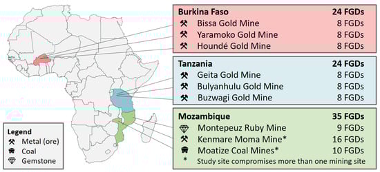 - Farnham, A.; Cossa, H.; Dietler, D.; Engebretsen, R.; Leuenberger, A.; Lyatuu, I.; Nimako, B.; Zabre, H.R.; Brugger, F.; Winkler, M.S. Investigating health impacts of natural resource extraction projects in Burkina Faso, Ghana, Mozambique, and Tanzania: Protocol for a mixed methods study. JMIR Res. Protoc. 2020, 9, e17138. [Google Scholar] [CrossRef]