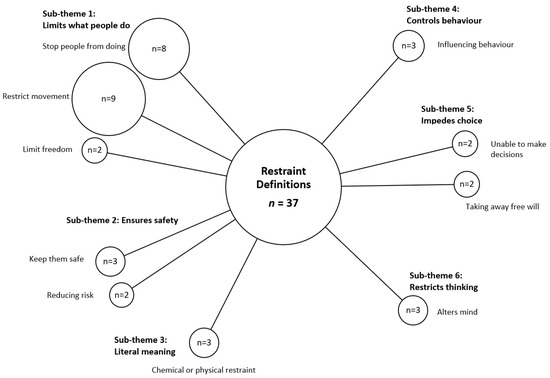 The codes and sub-themes relating to the overriding theme of ‘understanding of restraint’ are presented as a bubble plot below (Figure 1). A summative approach was used to calculate the total number of definitions including a coded element. The size of the bubble is proportional to the number of definitions coded to each sub-theme [23].
