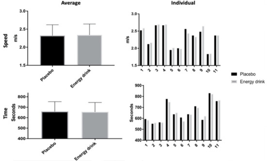 - Prins, P.J.; Goss, F.L.; Nagle, E.F.; Beals, K.; Robertson, R.J.; Lovalekar, M.T.; Welton, G.L. Energy drinks improve five-kilometer running performance in recreational endurance runners. J. Strength Cond. Res. 2016, 30, 2979–2990. [Google Scholar] [CrossRef]