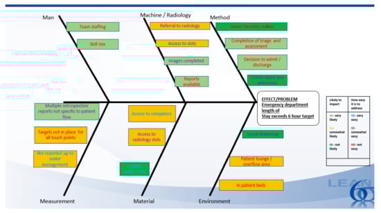 Doggett [36] (2005) wrote that cause-effect analysis diagrams illustrate the possible causes of a particular problem by sorting and relating them using a classification scheme. In this project, the fishbone cause-effect analysis as demonstrated in Figure 3 supported further insight into probable causes of ED TAT not being detected which then had an impact on patient flow.