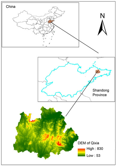 Qixia County (120°33′–121°15′ E, 37°05′–37°32′ N) was selected as the study region, which is characterized by mountainous and hilly terrain with a total area of 2017 km2. The altitude in the study region ranges from 53 to 830 m (Figure 1). The main soil types are mountain yellow-brown earth, alluvial soil, and aquic brown soil [24]. Qixia receives 743.1 mm of annual precipitation, four distinct seasons, large amount of sunshine, and a moderate amount of rainfall. The mean annual temperature of Qixia is 11.3 °C, with a frost-free period of 207 d and annual actual sunshine duration of 2760 h. It experiences a warm, temperate monsoon climate [24]. Qixia consists of six main tributaries with two dams, with a total length of approximately 184 km. The water area is approximately 1685 km2. According to the Qixia Yearbook 2018, the average daily water usage per person is approximately 117.82 L, and the annual water usage of the whole county is 4.19 million m3 [25].
