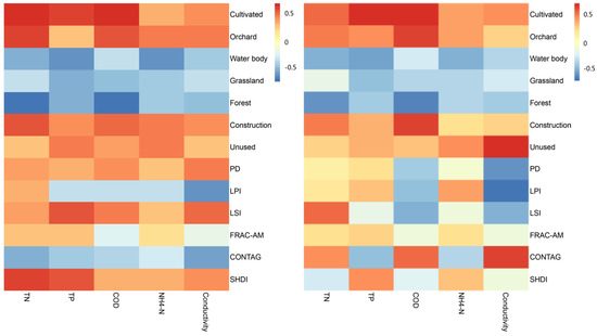 Spatial correlation analysis of the landscape spatial load contrast index and its correlation with the spatial distribution of the water body water quality index involves a collection of a series of spatial data analysis methods and techniques. Our Pearson analysis results showed that the proportion of land use areas and each water quality indicator were correlated (Figure 6). The areas characterized as cultivated land, orchards, construction land, and unused land were positively correlated with water quality indicators and were the main “source” types of the studied landscape. Forests, grasslands, and water areas had a negative correlation with water quality. The positive correlation of cultivated land and orchards with water quality was greater than that of construction land and water quality. The negative correlation between forests and water quality indicators was greater than that between grasslands and water quality indicators.
