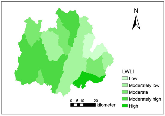 The weight allocation process is mainly based on empirical studies and expert opinions. Wang determined that the weight of a given landscape is related to its significance in the soil erosion process [11]. In light of this, in this study, farmland was assigned a weight value of 0.8 as it is a key pollution source, whereas orchards and construction land were assigned a weight value of 0.6 due to their potential contributions to pollution. The weight values of “sink” landscapes were determined by comparing their effects in mitigating pollution (Table 4). It is important to note that the LWLCI of NPS pollution zoning is a comprehensive index based on elevation, slope, distance, and landscape type, and can better reflect all types of water bodies.
