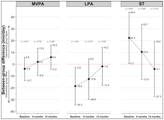 From baseline to 12-month follow-up, the intervention group increased LPA by 6.8 (95% CI: −4.2, 17.8; p = 0.228) min/day and decreased ST by 10.1 (95% CI: −25.6, 5.4; p = 0.203) min/day, whereas the control group decreased LPA by 9.9 min/day (95% CI: −19.6, −0.2; p = 0.044) and increased ST by 16.3 min/day (95% CI: 1.8, 30.8; p = 0.028) (Table 2).