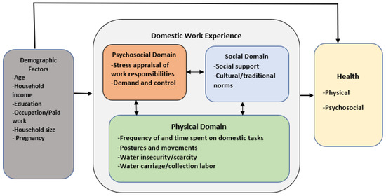 Demographic Factors [Grey Box, Figure 1]: Situational and contextual determinants of health, such as socioeconomic status or life stage and pregnancy status, may moderate women’s DWE, including the exposure and reaction to domestic work stressors [49,52,53]. Although variability in levels of domestic work stress/exposure is not the focus of this study, the model proposes that the magnitude of domestic work exposure varies over time, life stage, season, and place.