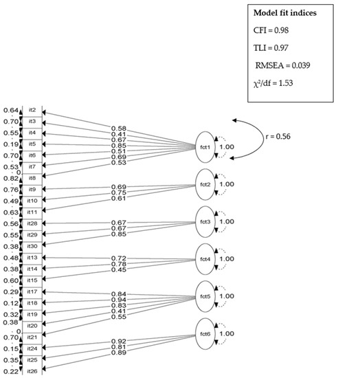 Since all items were categorical (ordinal data), a robust weighted least square estimation with mean and variance adjustment (WLSMV) was used to estimate model parameters—the residual variances among items, and covariance between factors, and the estimated factor loadings. The goodness-of-fit for CFA models was determined by the comparative fit index (CFI), the Tucker–Lewis index (TLI), the root mean square error of approximation (RMSEA), and the Kline method for assessing model fit using the χ2 statistic. As a rule of thumb, CFA and TLI values of ≥0.9 signifies very good model fit. For RMSEA, values of ≤0.06 indicate good model fit, values ≤0.08 indicate moderate model fit, and values ≥0.1 indicate poor fit [67]. Lastly, a non-significant χ2 or a ratio of χ2 to degree of freedom (df) <3 demonstrate a good model fit for the Kline method [68]. The cut-off value used to determine item loading on a related factor was 0.40 with p-value < 0.05. Modification indices were added to improve model fit while the factor structure essentially remained the same. Factors were allowed to correlate, and the variance of each factor was set to 1.0 in all models.