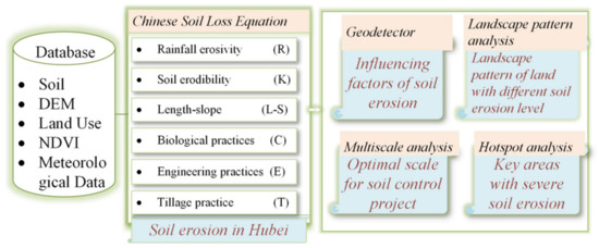To address the abovementioned issues, this study assessed the multi-scale spatial and temporal variation of soil erosion losses in Hubei Province in 2000, 2005, 2010, 2015, and 2020 using the Chinese version of the RUSLE model, Chinese Soil Loss Equation (Figure 1). Compared with previous studies, this study innovatively examined the scale effects of soil erosion based on different administrative scales and identified effective control types and areas by integrating landscape patterns and hotspot analysis to suggest effective erosion control in regional landscape planning. The main objectives of this study were to: (1) Reveal the spatial characteristics of soil erosion; (2) Quantify the contributions of different influencing factors; (3) Identify the optimal control units and key areas.