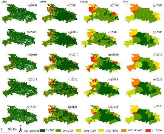 The average soil erosion rate at the (a–e) gird scale, (f–j) town scale, (k–o) county scale, and (p–t) city scale from 2000 to 2020.