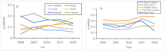 The q values of influencing factors on soil erosion from 2000 to 2020 ((a) q statistic; (b) interaction q statistic).