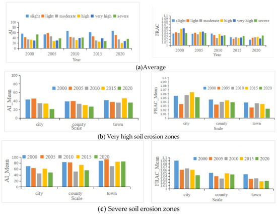 (a) AI and FRAC indexes of land at different soil erosion levels. (b) Mean value of AI and FRAC at three scales of very high erosion zones from 2000 to 2020. (c) Mean value of AI and FRAC at three scales of severe erosion zones from 2000 to 2020.