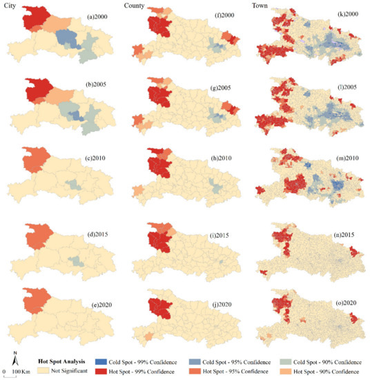 Compared to the city scale (Figure 6a–d), two hotspots, the northeast and southwest, have appeared at the county scale. They both decreased gradually from 2000 to 2010. The cold spot at the town scale formed a patch in the central plains that decreased from 2000 to 2015 and disappeared in 2020. It is worth noting that this cold spot area did not overlap with the cold spot area at the city scale.
