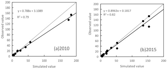 Correlation analysis between simulated value (105 t) and observed value (105 t) in (a) 2010 and (b) 2015.