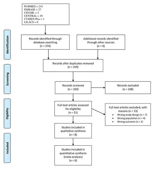 The flow chart of the study selection process is shown in Figure 1. The initial search found that 274 references and 259 studies remained after removing duplicates. After abstract and title screening, 238 studies were excluded. Twenty-one full texts remained, which were assessed for eligibility, leading to the exclusion of 13 studies due to wrong study design (n = 7), wrong population (n = 4), and wrong outcome (n = 2). Eight articles were finally included [35,36,37,38,39,40,41,42]. Therefore, the intervention of the third reviewer was not necessary. The reverse search did not return any additional references.