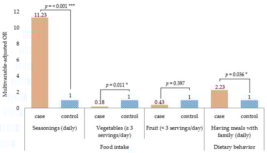 Dietary habits associated with type 2 diabetes mellitus in a case–control study of the urban residents in Yangon, Myanmar, 2019. Note: Multivariable logistic regression analysis; p-value for the comparison between two groups: *** p < 0.001, * p < 0.05. All p-values are two-sided.