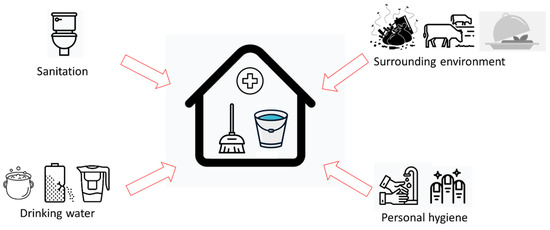There are 16 hygiene-related variables used in this study (Table 1). As mentioned in the introduction, these variables were selected based on previous household hygiene studies [5,11,12,13,14]. This study categorized those variables into four main clusters of household hygiene: sanitation, surrounding environment, drinking water, and personal hygiene (Figure 2).