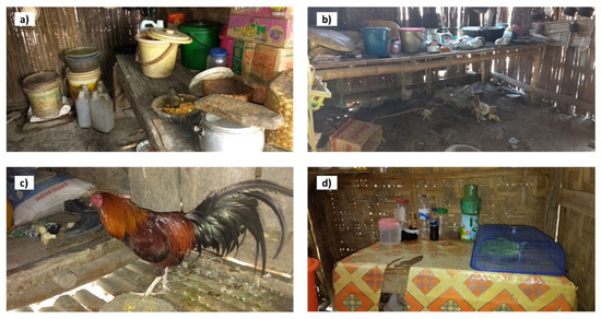 Most of the respondents were a mother (84.5%), while others were the father or household head. The proportion of households with and without children under the age of 5 was almost equal, i.e., 47.8% and 52.2%, respectively. The mean schooling time of the mother was 7.7 years (SD = 3.6), while that of the household head or father was 7.4 (SD = 3.6). About one-fourth of the respondents (26.3%) practiced the local belief “Marapu”. The mean spare time of the respondents was 2.9 h in a day (SD = 2.1). In terms of the accessibility of the location of the respondent’s house, about 54% of the respondents were located in an area where it was relatively difficult to access the market. The majority of the respondents had a non-permanent wall (87.8%), e.g., bamboo or wood, and a non-permanent floor (72.3%), e.g., bamboo, earthen, or compacted soil, while only 7.9% had a non-permanent roof, e.g., straw. Having livestock was common, i.e., 89.9% of respondents had at least one pig, and 25.5% had a cow(s). A total of 78.8% of households were observed to cover their food. Figure 3 shows examples of the house kitchen conditions in the study area.