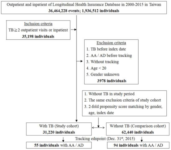 Previous studies demonstrated that patients with TB have a higher risk of developing systemic diseases such as liver cirrhosis, Parkinson’s disease, sarcoidosis, systemic lupus erythematosus, acute coronary syndrome, and peripheral arterial disease [13,14,15,16,17,18]. Inflammation caused by immune response activation and cytokine induction is a crucial pathogenic mechanism of TB infection [19]. Chronic inflammation also plays an essential role in atherosclerosis, which leads to the development of various cardiovascular diseases [20,21]. Because chronic inflammation increases the risk of developing AA and AD [22,23], and as TB may cause chronic inflammation, we hypothesized that patients with TB have an increased risk of developing AA and AD. We conducted this nationwide population-based cohort study to assess the association between these two diseases.