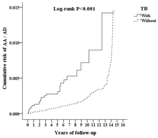 Patients with TB had a higher risk for further development of AA and AD than patients without TB (adjusted HR = 1.711; 95% CI = 1.098–2.666; p < 0.001) in Table 2. The risk of AA and AD was higher in patients with HTN, IHD, and stroke than in patients without these comorbidities. As shown in Figure 2, the cumulative incidence of AA and AD in subsequent years was higher in the TB cohort than in the non-TB cohort (log-rank test, p < 0.001).