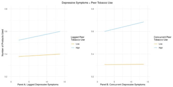 Next, in order to test Hypothesis 2 and examine whether peer tobacco use served as a moderating/exacerbating factor in the association between depressive symptoms and the trajectory of the number of tobacco products, concurrent and lagged peer tobacco use variables were included in the model as both main/independent effects and in two-way interactions with depressive symptoms (i.e., concurrent peer tobacco use × concurrent depressive symptoms, and lagged peer tobacco use × lagged depressive symptoms). The R emtrends function [41] was used to examine significant interaction effects by using model-based estimates of the relationship between depressive symptoms and the number of products used (i.e., the depressive symptoms simple slope) at one standard deviation (SD) above and below the mean of peer tobacco use.