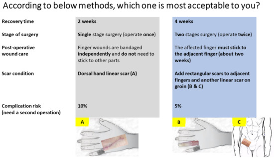 We set the scenario of the survey as follows: “You have had an injury causing a soft tissue defect at the little finger” (Figure 1). Then, the respondents had to provide their level of acceptance according to different attributes and further choice-based conjoint (CBC) tasks.