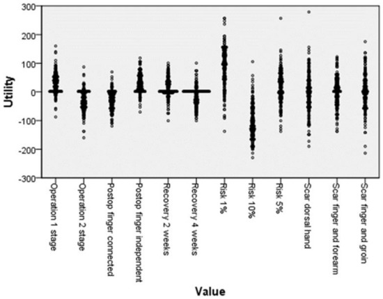 Utility among the attributes and values is shown in Table 3. The complication rate of 1% had the highest utility (87.28), whereas 10% had the lowest utility (−104.97). The importance score (Figure 3) demonstrated that complication risk was considered as the most important attribute in decision making, followed by scar condition. However, this was only the global preference. When observing the wide variety of utility levels among the participants (Figure 4), it was noted that not all participants see things in the same way.