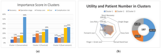 (a) Mean utility and patient numbers of the three clusters. The radar plot reveals a striking pattern of differences between clusters. For example, cluster 1 shows a strong preference for less risk compared to other clusters. (b) The importance score per cluster.