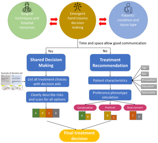 Based on the study results, we incorporated patient preferences into the decision-making model of hand trauma illustrated in Figure 7. The surgical treatment for hand trauma, or specifically for soft tissue reconstruction, should be related to surgical techniques and hospital resources, patient conditions, and injury types. Considering the aforementioned factors, the authors divided the decision making into two pathways. If time, space, or language allowed for good communication, SDM would be applied. Decision aids were made following the format we used in the CA, clearly describing the complication risks and showing the scarring condition with figures. All the treatment choices would be presented to the patients, and they would finally choose the preferred one.