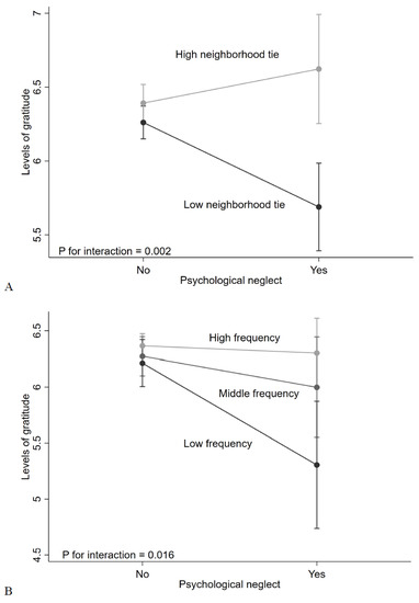 Association of emotional neglect with the levels of gratitude stratified by the levels of social ties: (A) the levels of neighborhood ties and (B) the frequency of meeting friends.