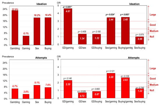 Figure 1 displays the bar-charts with the prevalence of suicidal behavior in the study (ideation and attempts), as well as the results of the pairwise comparisons between the diagnostic subtypes (OR and p-values). The presence of suicidal ideation achieved the highest prevalence in the patients with gambling disorder (22.9%), nearly followed by buying–shopping disorder (18.4%) and sex addiction (18.2%), while the prevalence for gaming disorder was the lowest (6.1%). Regarding the presence of suicide attempts, the highest prevalence was registered for sex addiction (9.1%), followed by buying–shopping disorder (7.6%) and gambling disorder (6.7%), and the lowest prevalence was obtained for gaming disorder (3.0%). Although there were no statistical differences in the post-hoc comparisons for the presence of suicide attempts between the diagnostic subtypes, OR coefficients were within the good to large range for the contrasts between gaming disorder and the other groups.