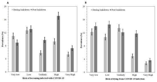 Figure 1a,b presents the percentage of responses for the items that make up the dependent variable:) the risk of becoming infected with COVID-19 and the risk of dying from COVID-19 infection, respectively. For each item, the proportion from both surveys who felt either at high or very high risk of contracting the infection was 39.9%, and about a quarter thought they were at risk of dying from the infection. Compared with during lockdown, significantly more respondents felt at high risk [17.12%; 95%CI 16.05–18.24% versus 9.27% 95%CI 8.46–10.15] and very high risk [7.21%, 95%CI 6.49–9.00% versus 5.34%, 95%CI 4.72–6.03%] of becoming infected from COVID-19 post-lockdown. Similarly, 11.76% [95%CI 10.85–12.72%] of respondents felt at high risk of dying from COVID-19 infection after the lockdown compared with 4.92% [95%CI 4.33–5.59%] during the lockdown.
