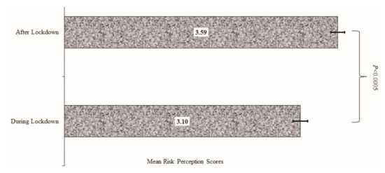 Mean score for the perceived risk of contracting COVID-19 after and during lockdown.