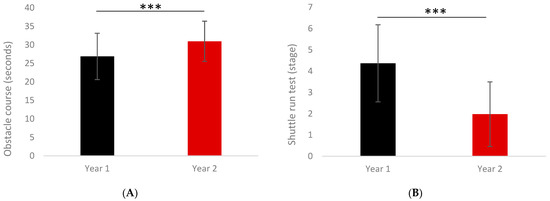 Performances at the Motor Skills Obstacle Course (A) and shuttle-run test (B) between T0 (year 1) and T1 (year 2). *** p < 0.0001.